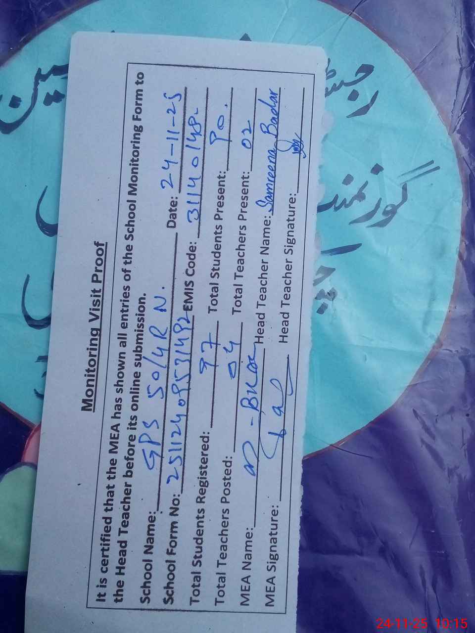 | Attendance Register | Head Teacher | MEA with School | Visit Proof |