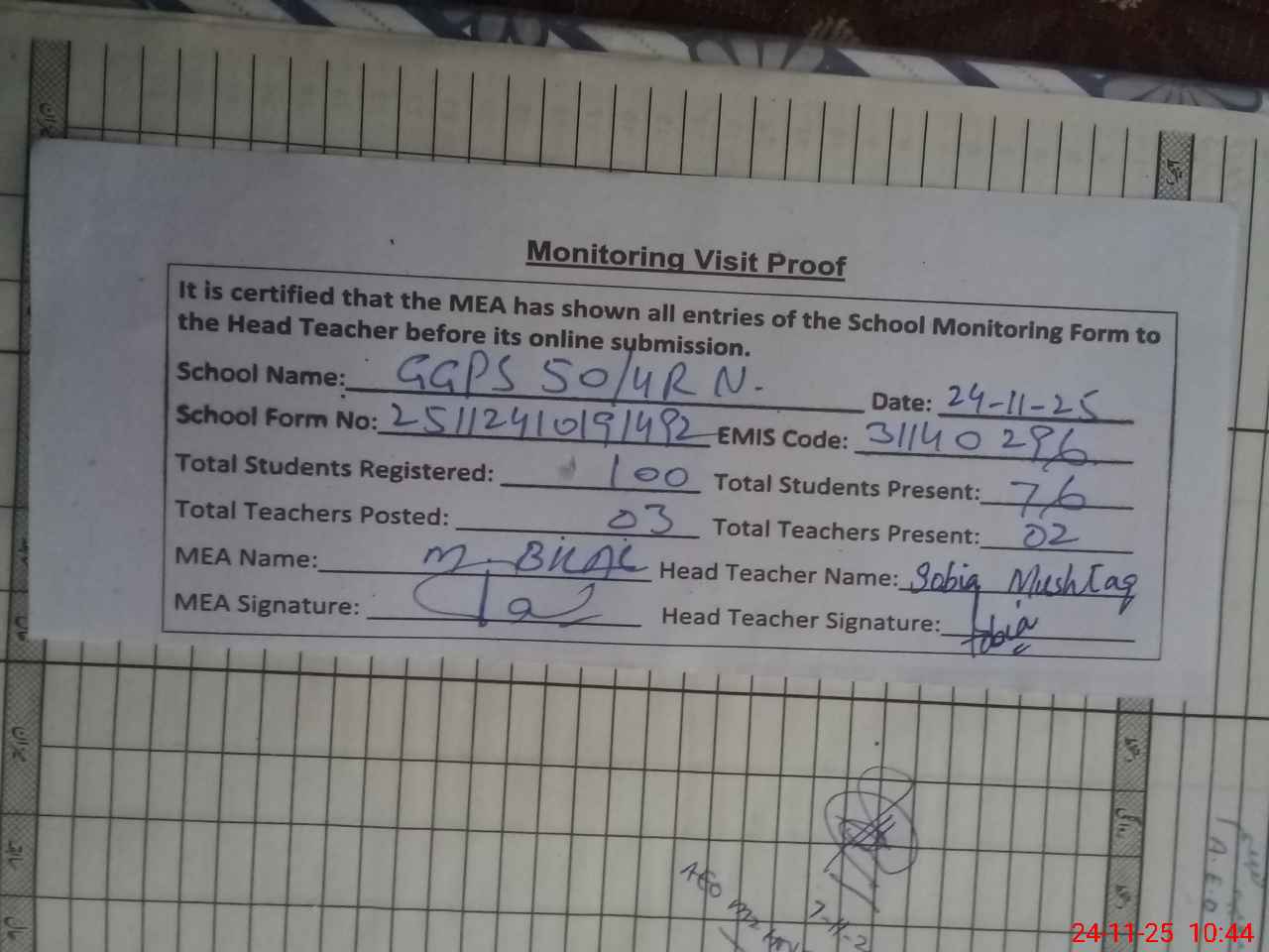 | Attendance Register | Head Teacher | MEA with School | Visit Proof |