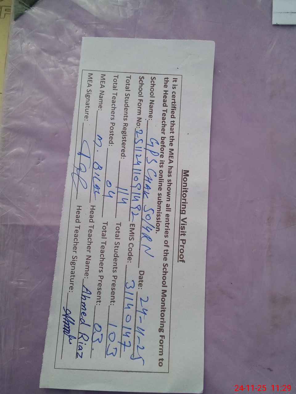 | Attendance Register | Head Teacher | MEA with School | Visit Proof |