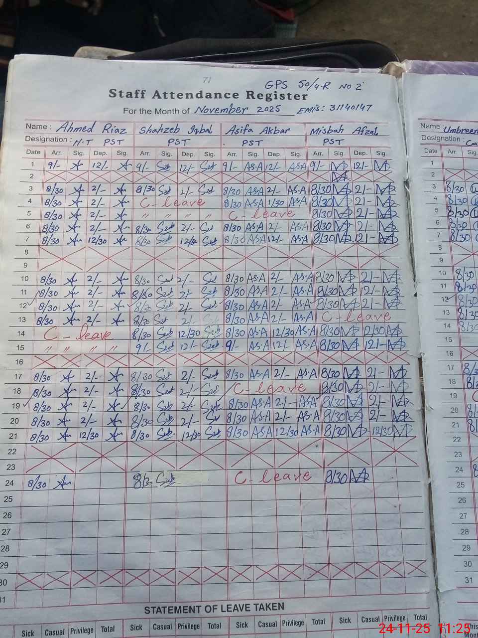 | Leave | Duty | Absent | Maternity | Medical | Ex- Pak |