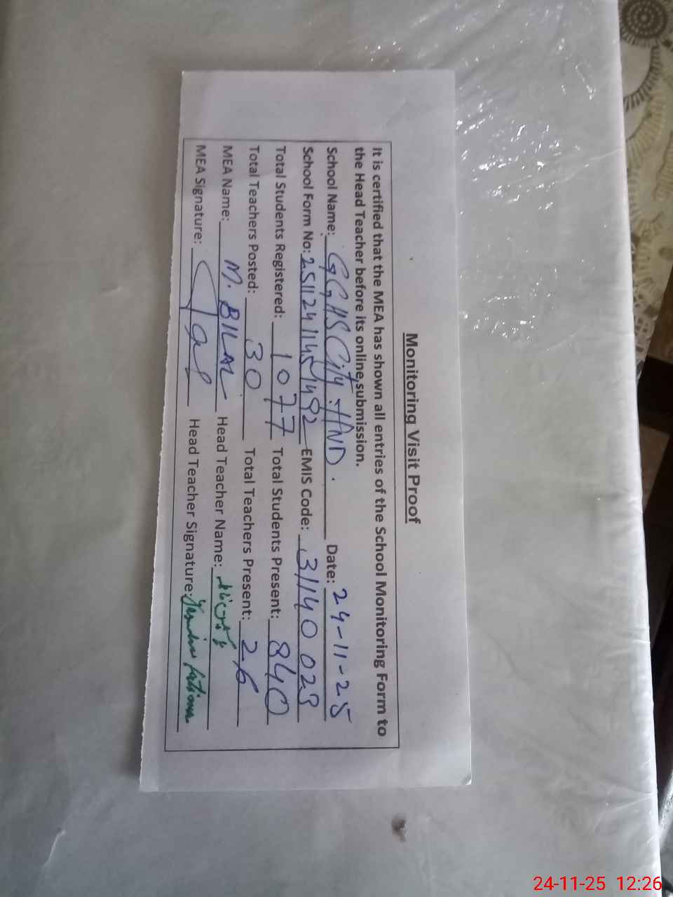 | Attendance Register | Head Teacher | MEA with School | Visit Proof |