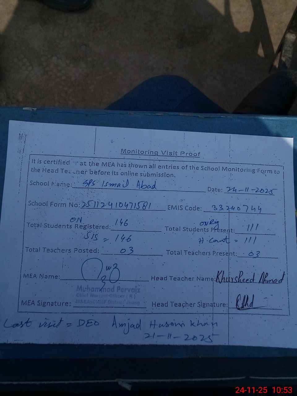 | Attendance Register | Head Teacher | MEA with School | Visit Proof |