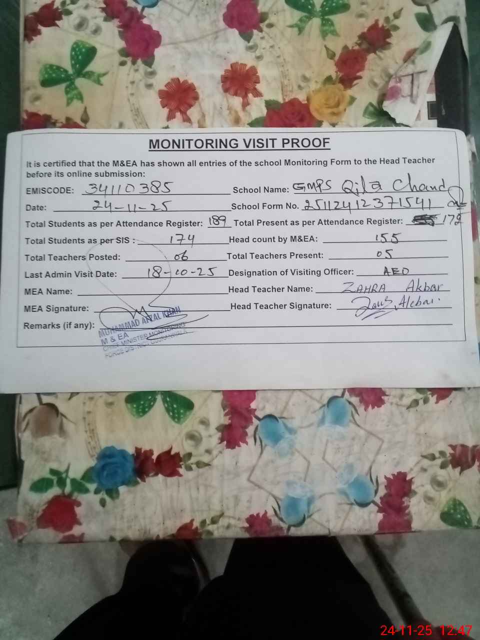 | Attendance Register | Head Teacher | MEA with School | Visit Proof |