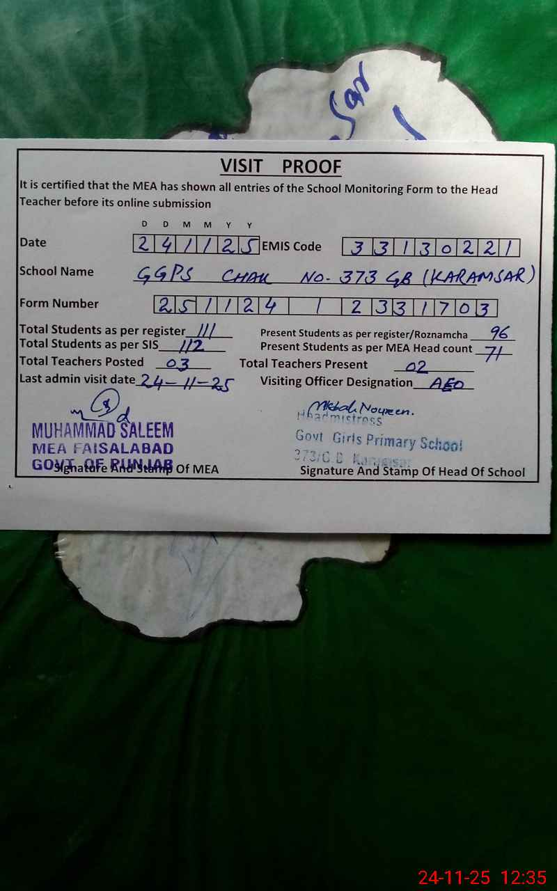 | EMIS Code: 33130221 | Name of School: GGPS CHAK 373 GB KARAM SAR SAMUNDRI | |||