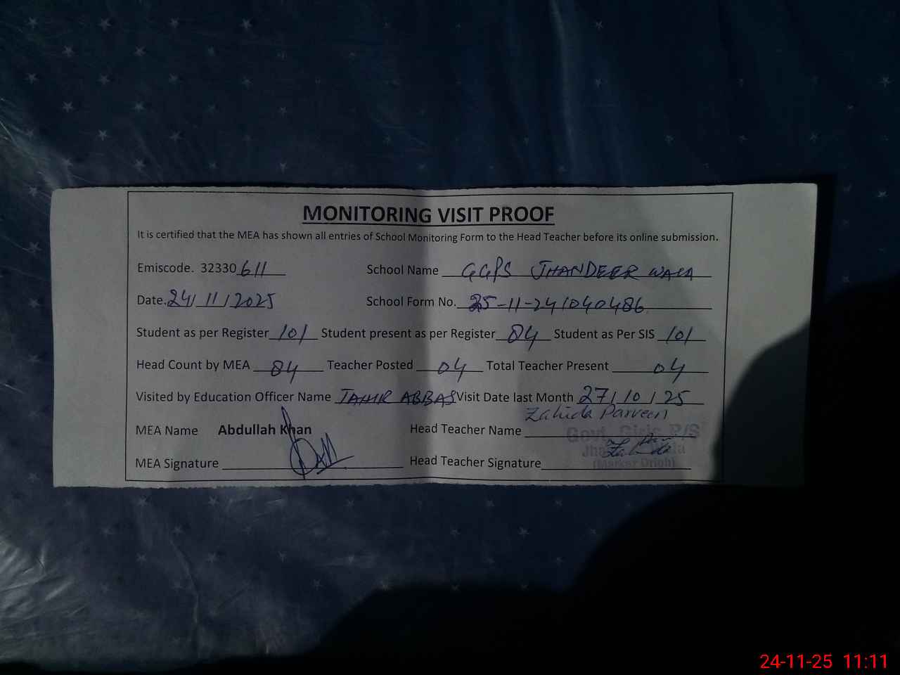 | Attendance Register | Head Teacher | MEA with School | Visit Proof |