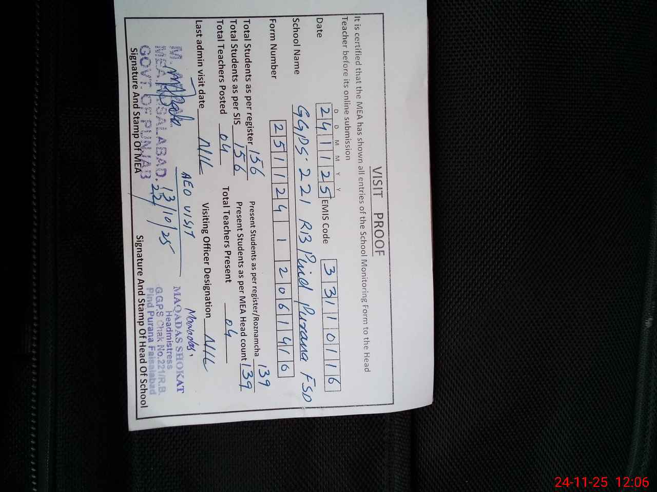 | EMIS Code: 33110116 | Name of School: GGES CHAK NO 221 RB PIND PURANA | |||