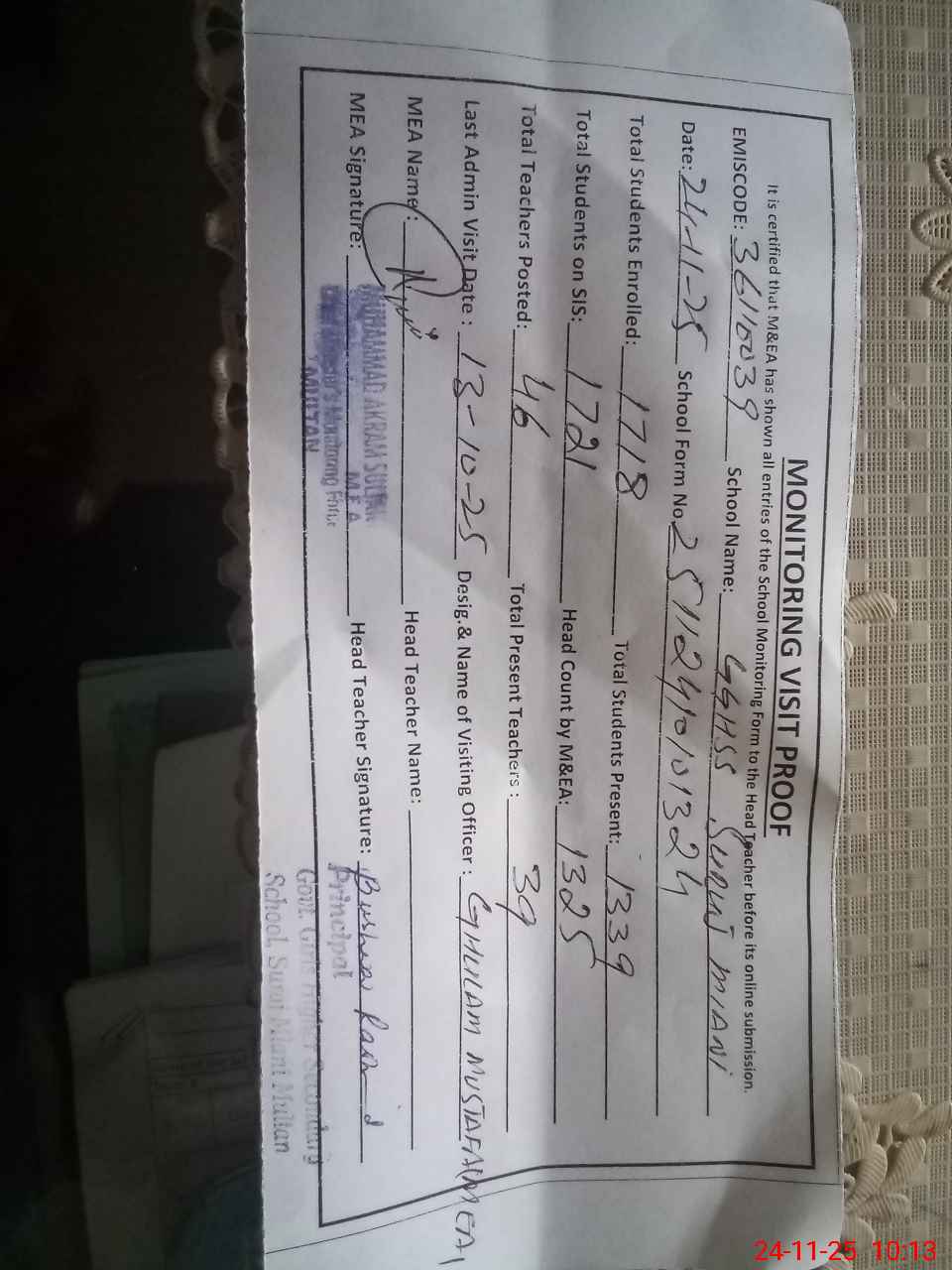 | EMIS Code: 36110039 | Name of School: GGHSS SURAJ MIANI MULTAN | |||