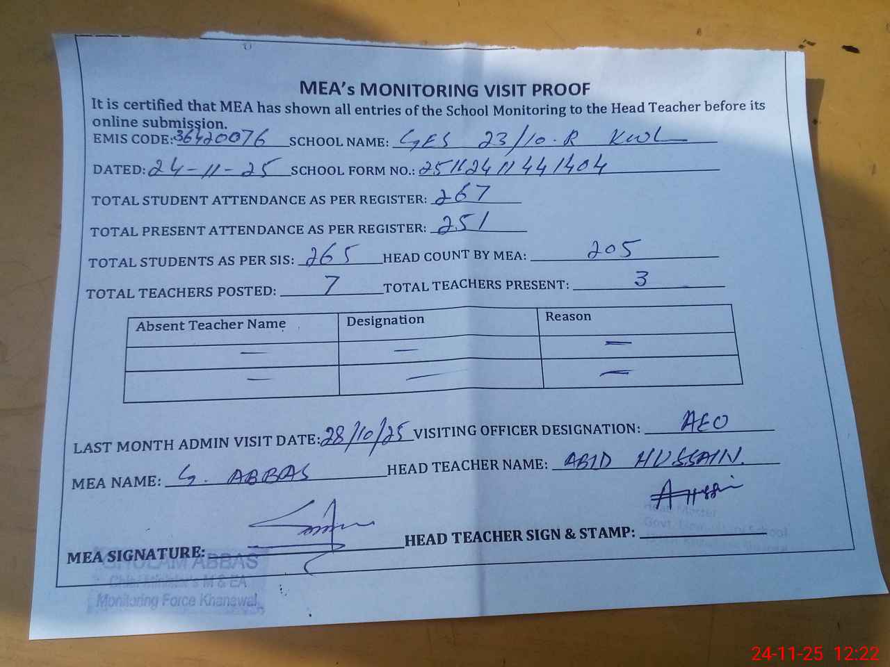 | Attendance Register | Head Teacher | MEA with School | Visit Proof |