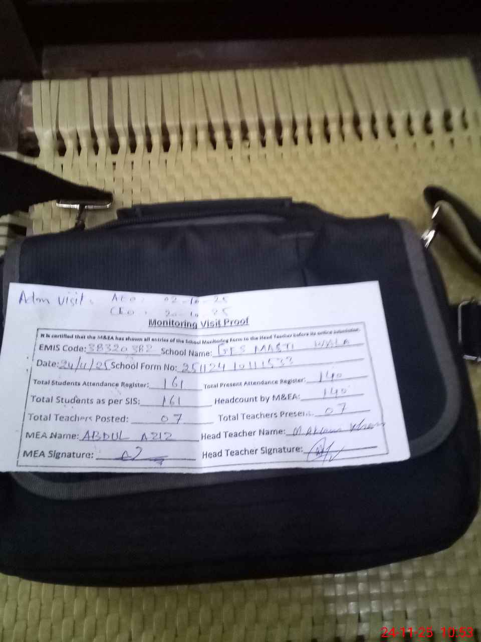 | Attendance Register | Head Teacher | MEA with School | Visit Proof |
