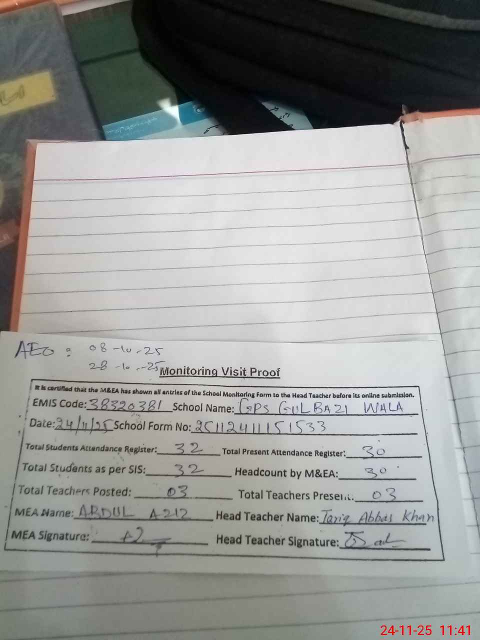| Attendance Register | Head Teacher | MEA with School | Visit Proof |
