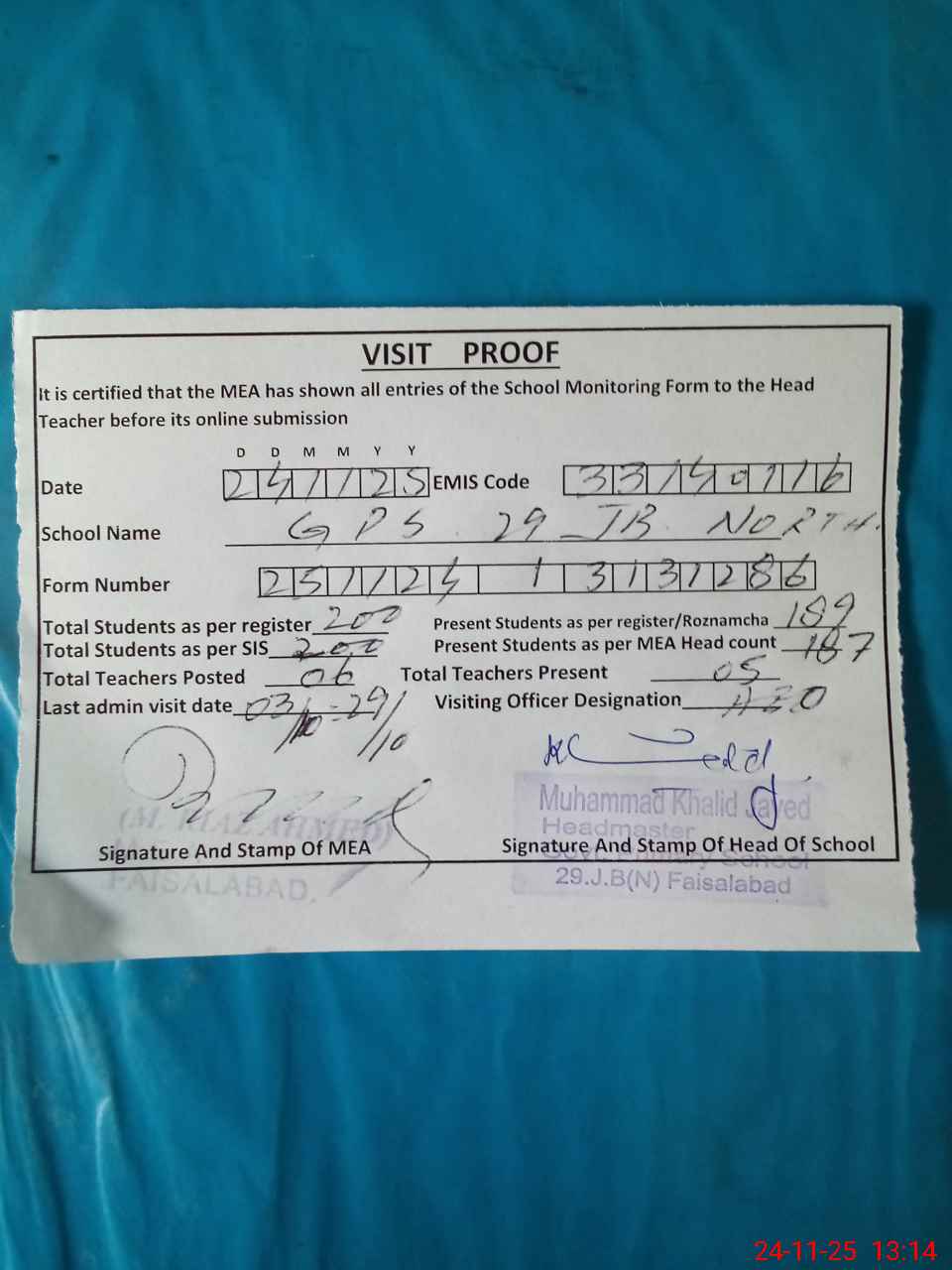 | Attendance Register | Head Teacher | MEA with School | Visit Proof |