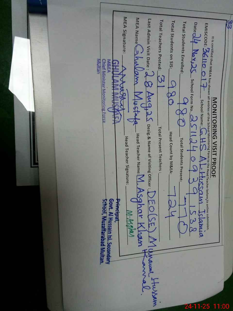 | EMIS Code: 36110017 | Name of School: GHS AL-HUSSAIN ISLAMIA MUZAFFAR ABAD MULTAN | |||