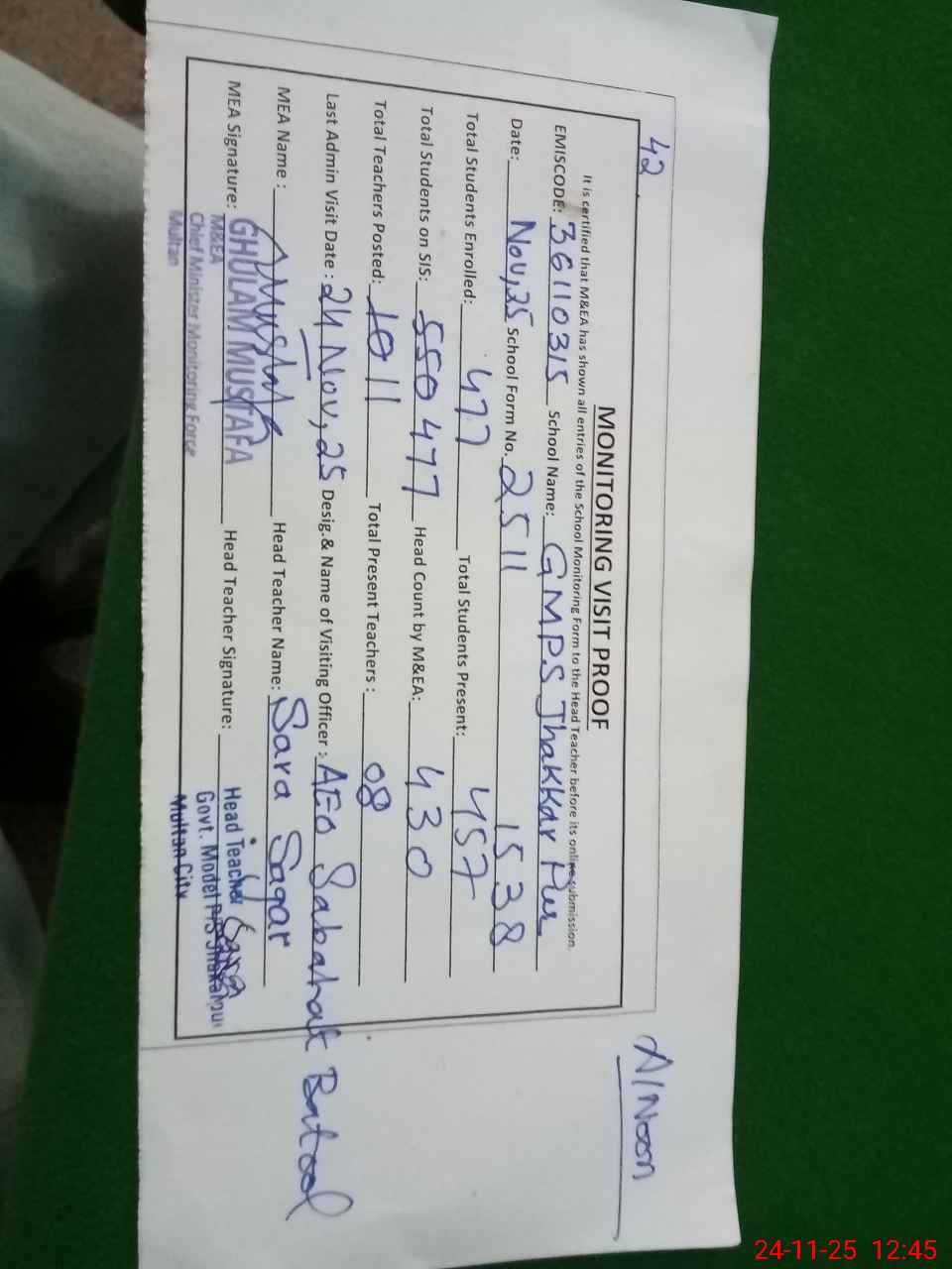 | Attendance Register | Head Teacher | MEA with School | Visit Proof |