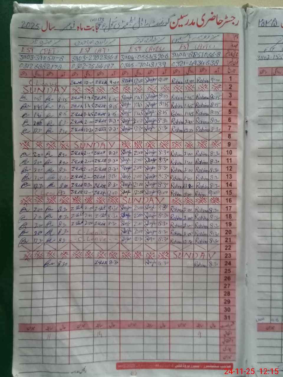 | CNIC | Full Name | Designation | R/C | Absence During Last Calender Month |