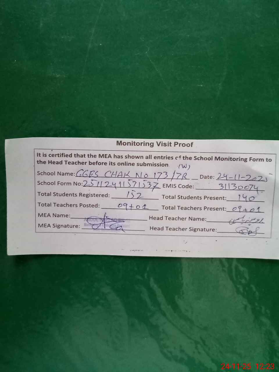 | Attendance Register | Head Teacher | MEA with School | Visit Proof |