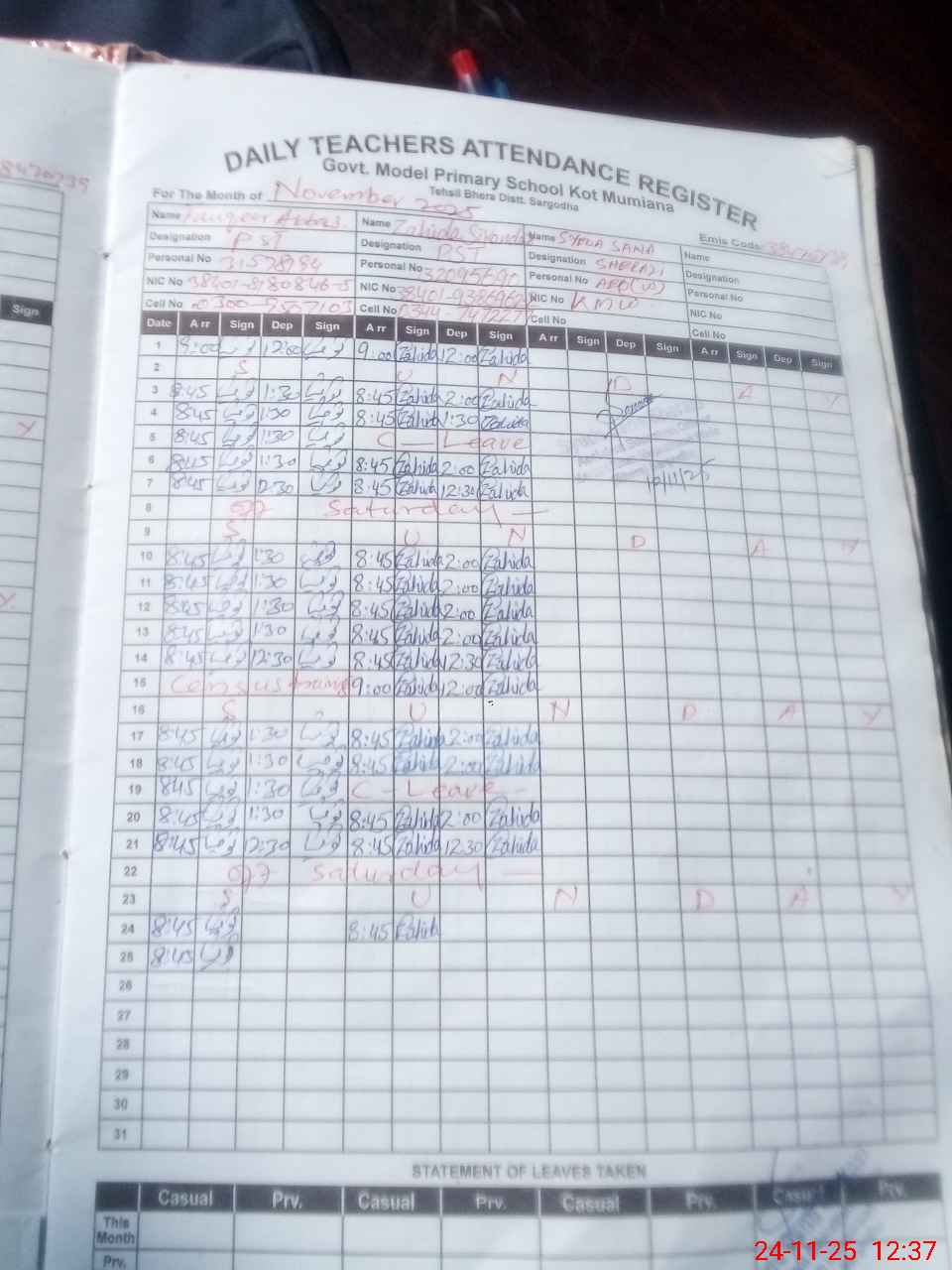 | CNIC | Full Name | Designation | R/C | Absence During Last Calender Month |