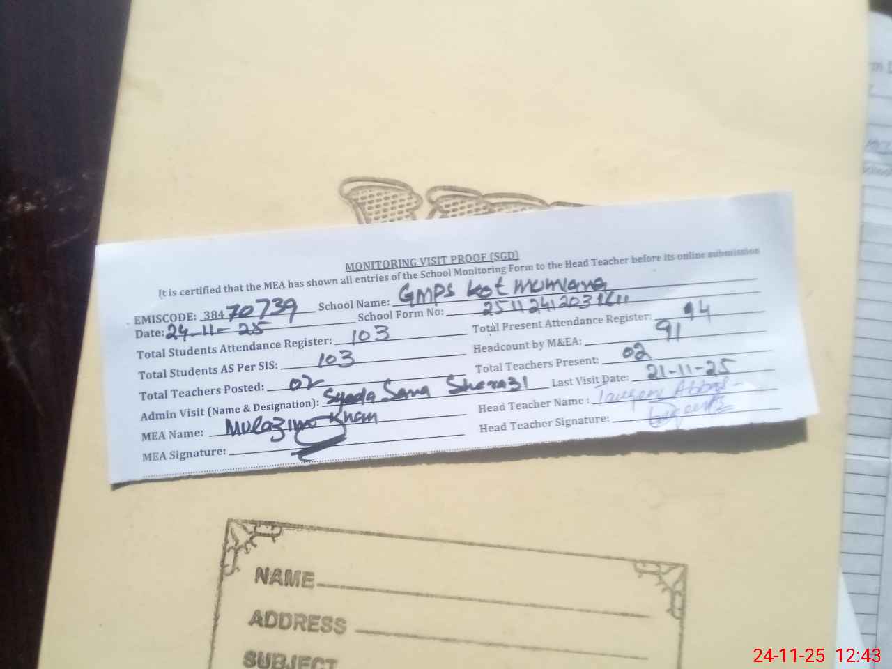 | Attendance Register | Head Teacher | MEA with School | Visit Proof |