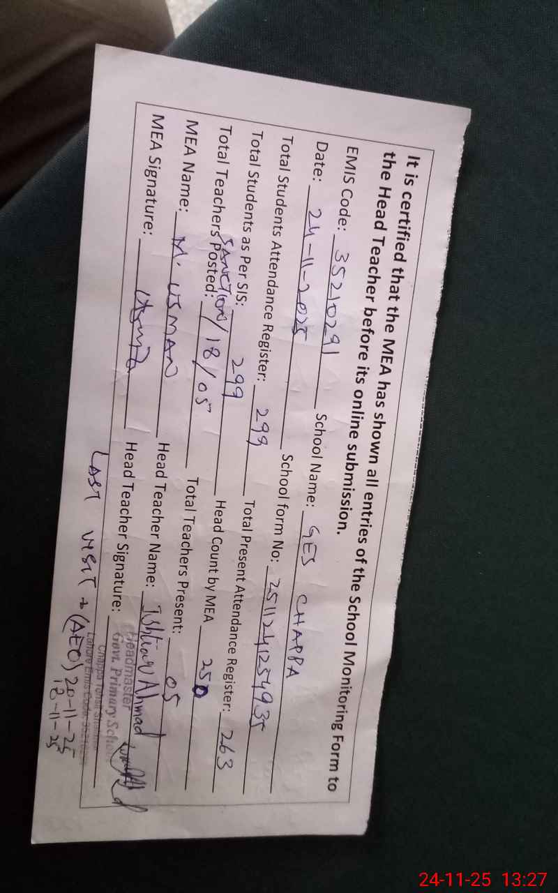 | Attendance Register | Head Teacher | MEA with School | Visit Proof |