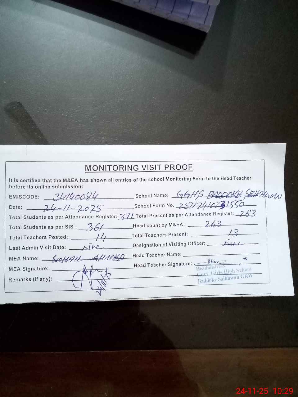 | Attendance Register | Head Teacher | MEA with School | Visit Proof |