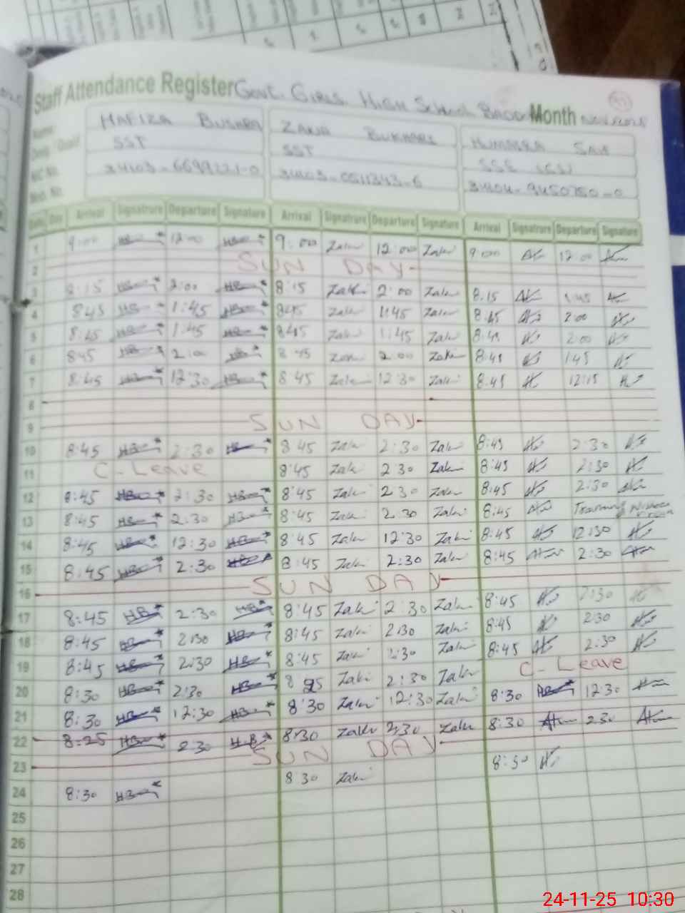 | CNIC | Full Name | Designation | R/C | Absence During Last Calender Month |