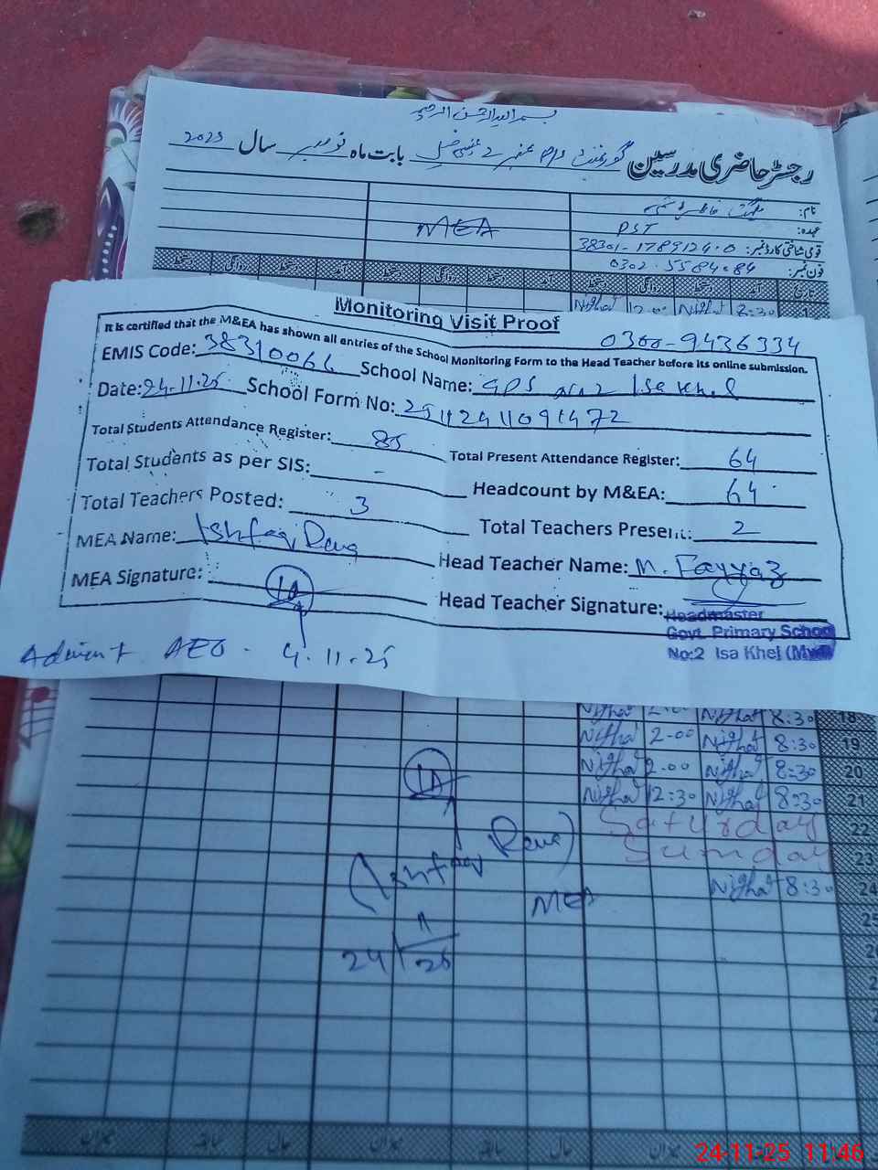 | Attendance Register | Head Teacher | MEA with School | Visit Proof |