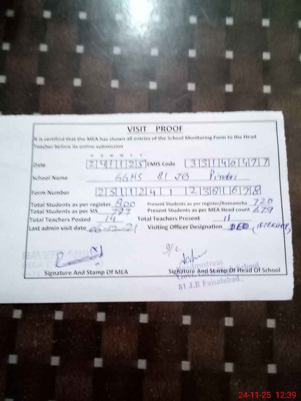 | Certified that this School was Inspected by the Undersigned MEA/DMO Today and the Information Stated Above is as Per Record. | |||||