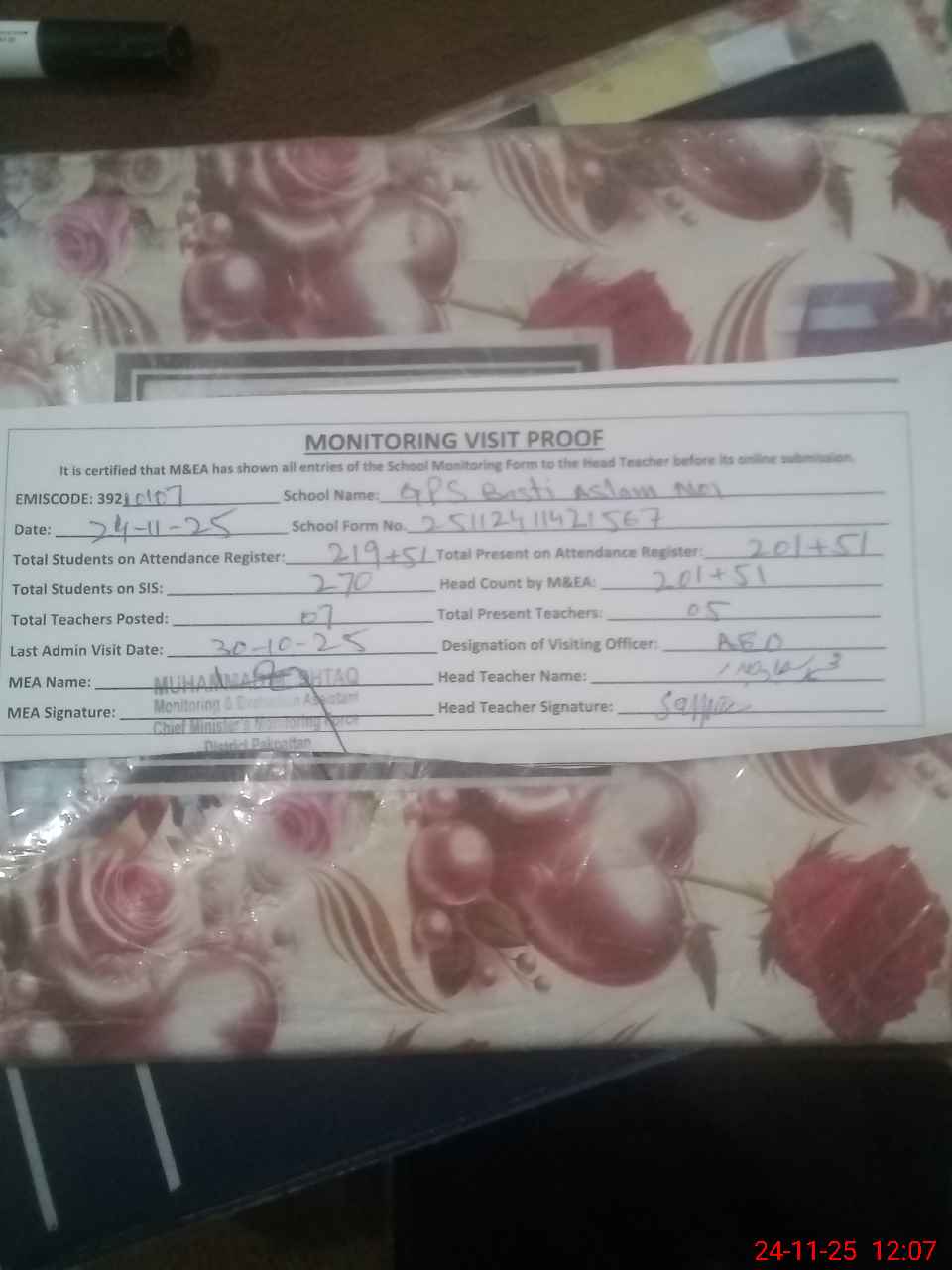 | Attendance Register | Head Teacher | MEA with School | Visit Proof |