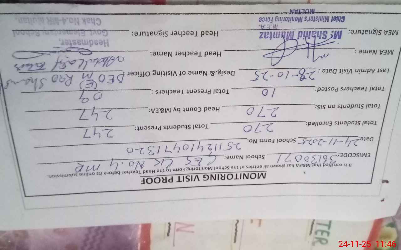 | Certified that this School was Inspected by the Undersigned MEA/DMO Today and the Information Stated Above is as Per Record. | |||||