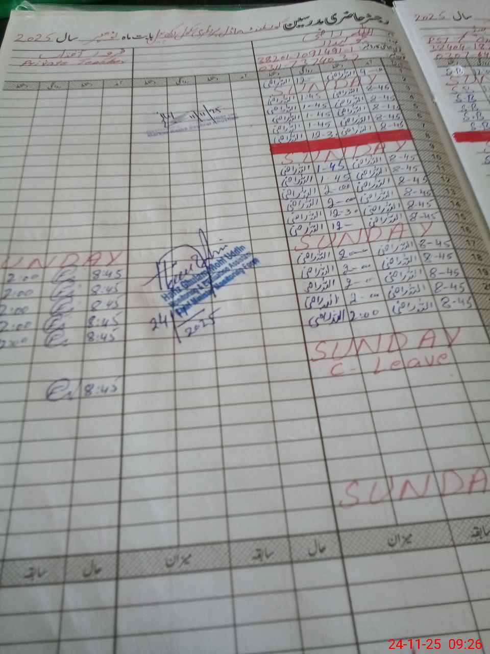 | CNIC | Full Name | Designation | R/C | Absence During Last Calender Month |