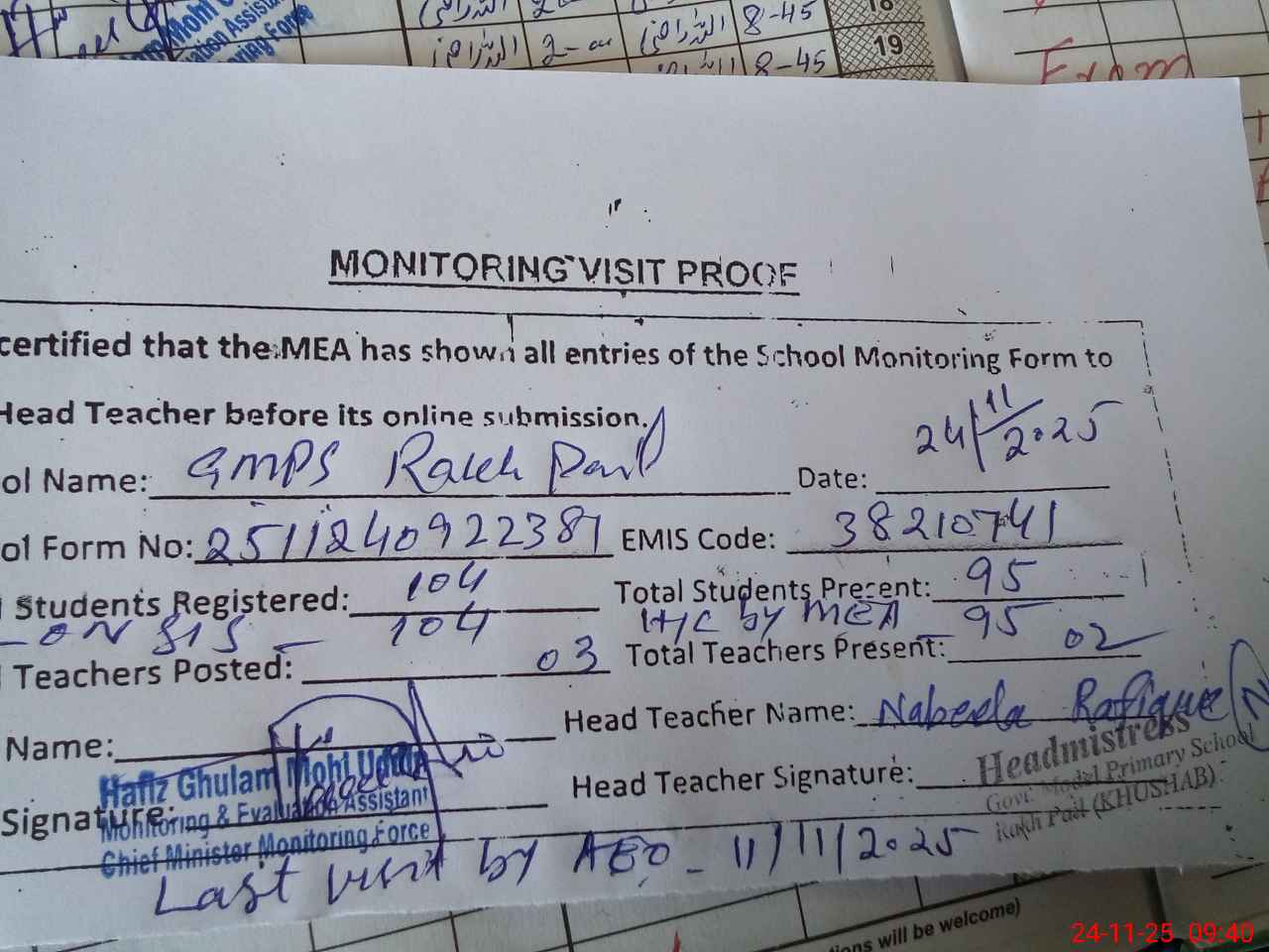 | Attendance Register | Head Teacher | MEA with School | Visit Proof |
