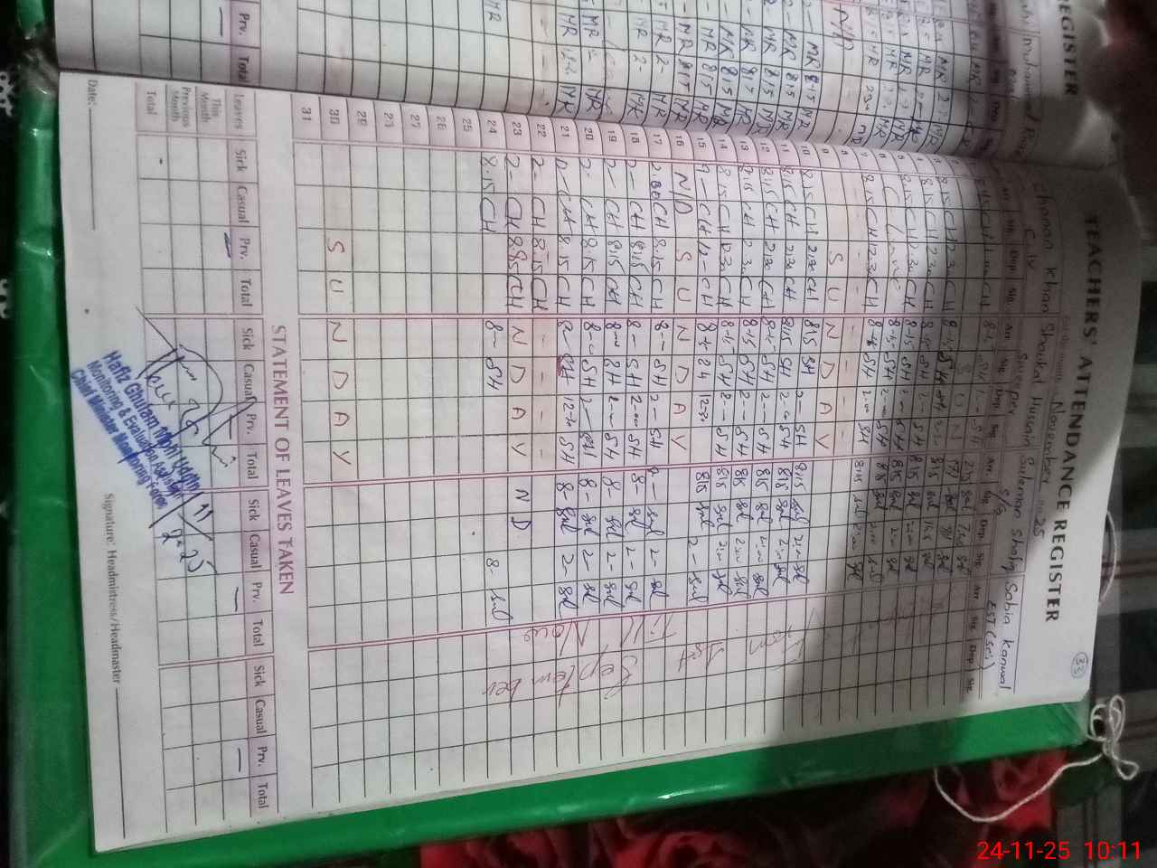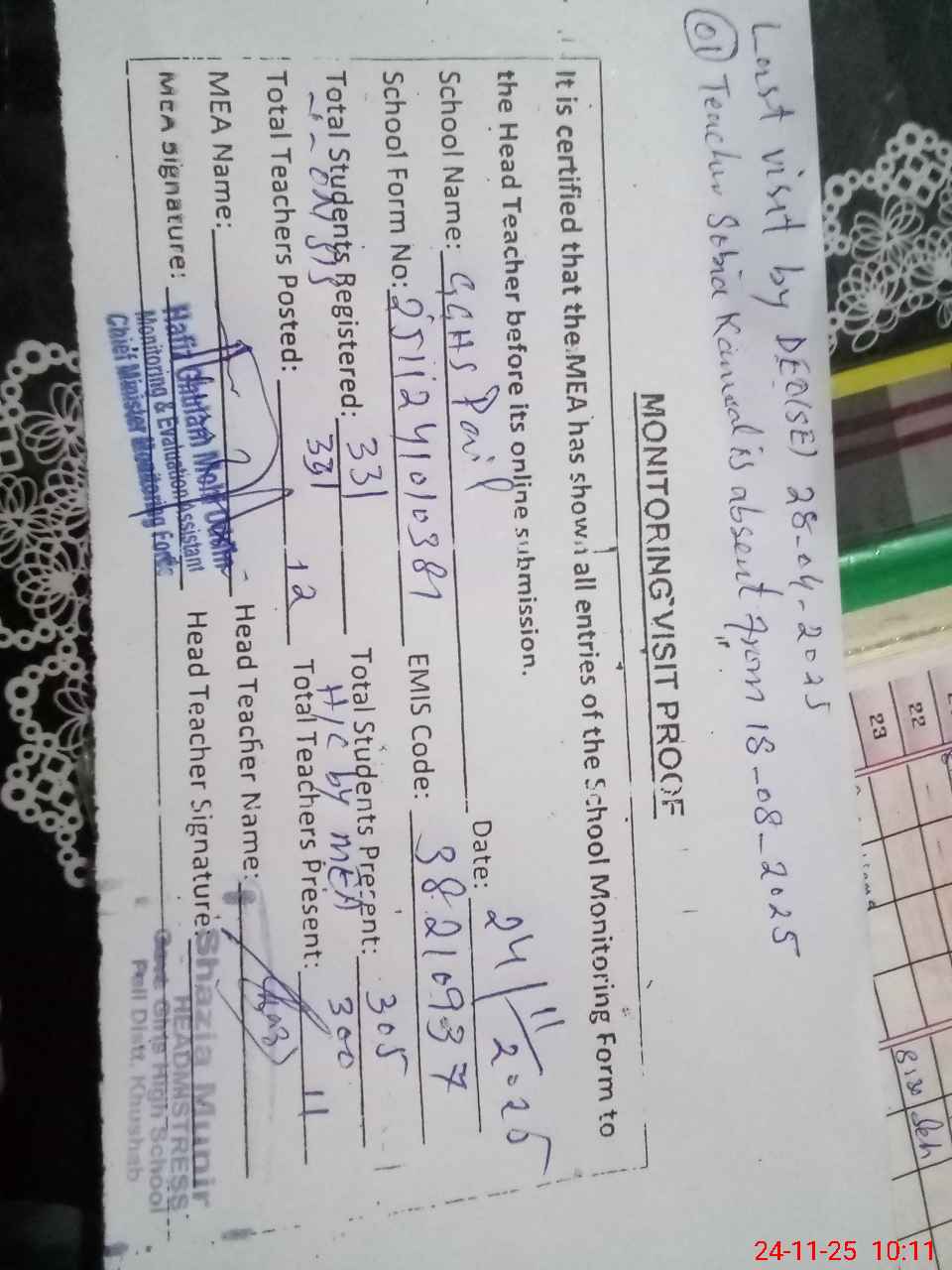 | Remarks (Use Separate Page if Required): last visit by DEO (SE) 28 April 2025 01 teacher is absent Sobia Kanwal EST from 18 August 2025 | |||||