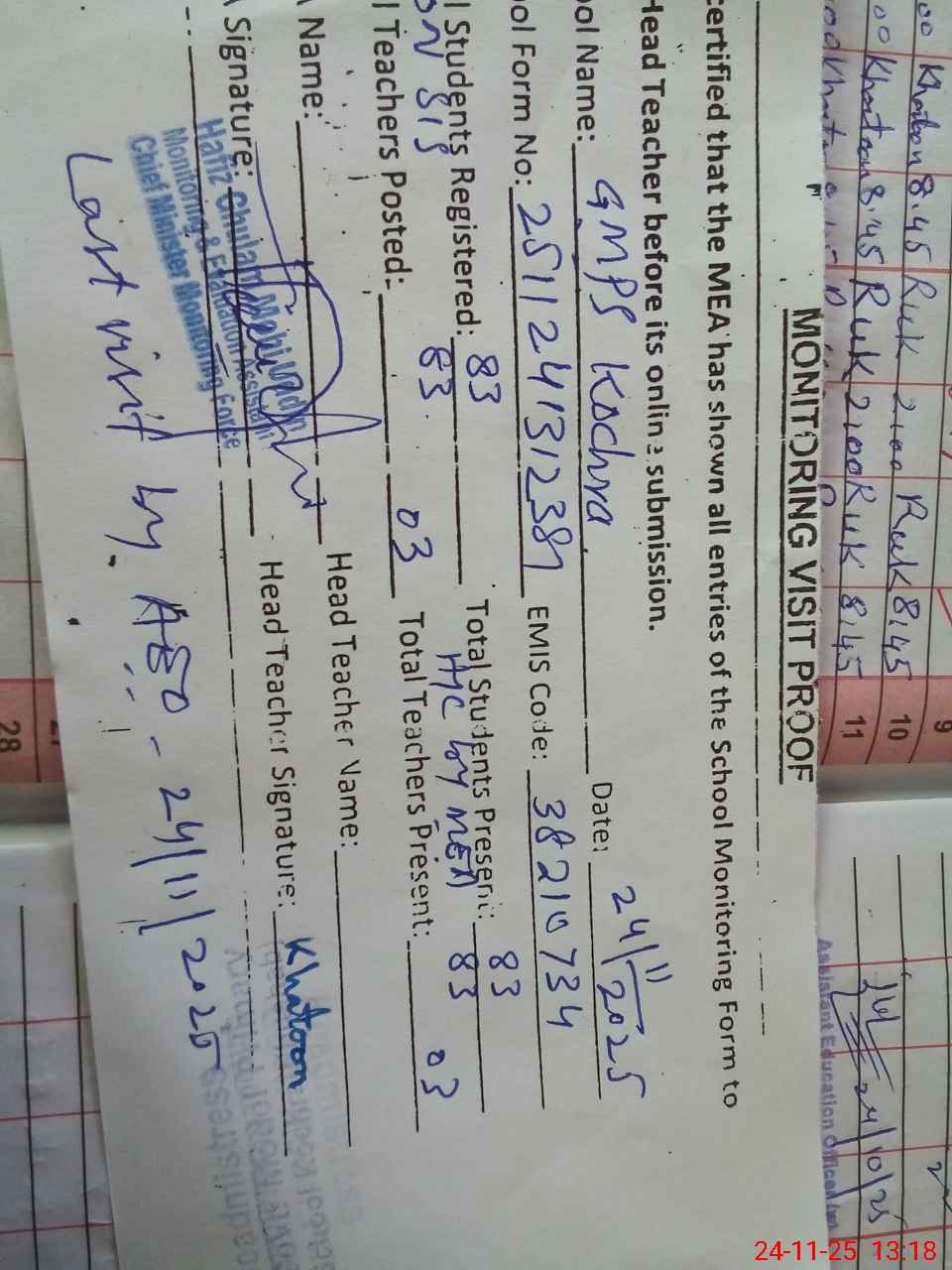 | Attendance Register | Head Teacher | MEA with School | Visit Proof |
