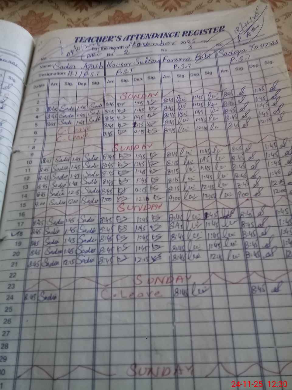 | CNIC | Full Name | Designation | R/C | Absence During Last Calender Month |