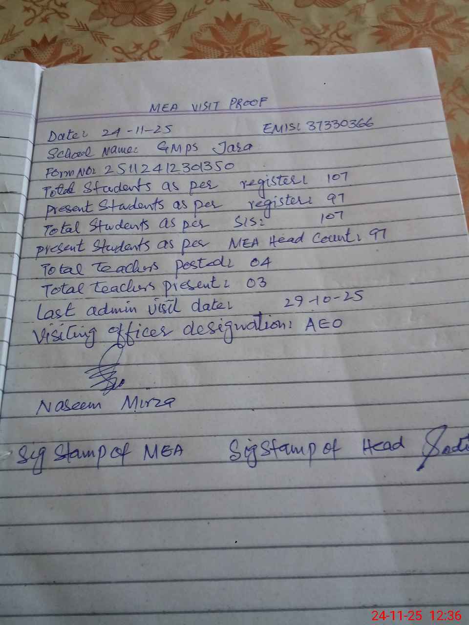 | Attendance Register | Head Teacher | MEA with School | Visit Proof |