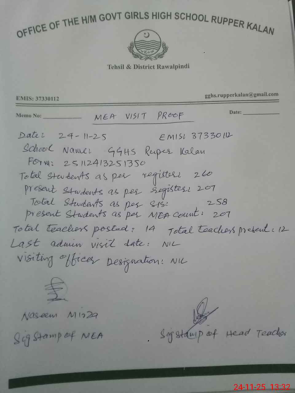 | Certified that this School was Inspected by the Undersigned MEA/DMO Today and the Information Stated Above is as Per Record. | |||||
