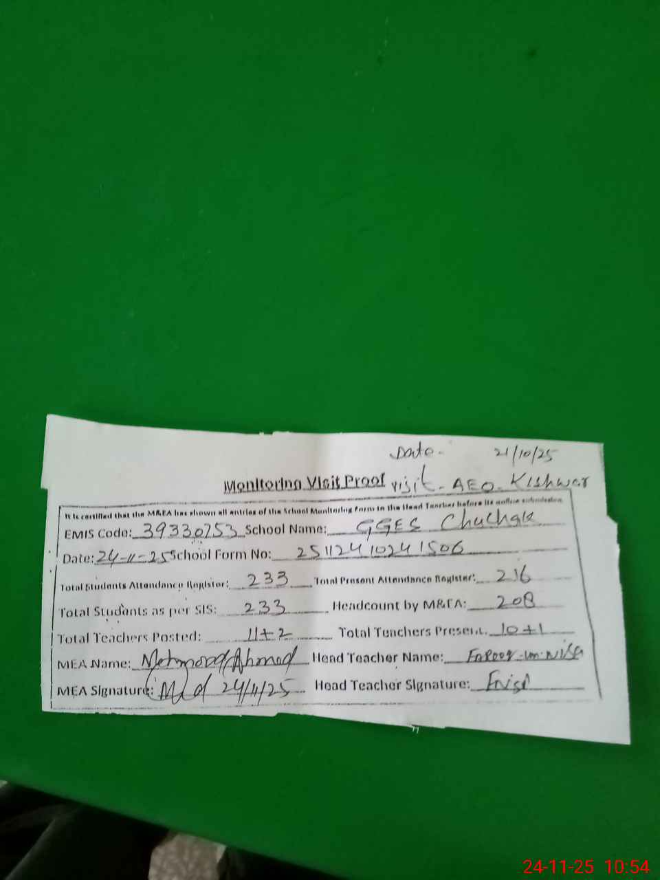 | Attendance Register | Head Teacher | MEA with School | Visit Proof |