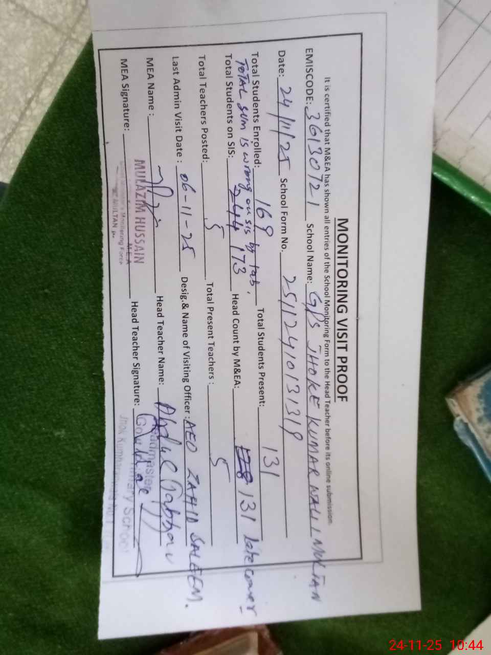 | Certified that this School was Inspected by the Undersigned MEA/DMO Today and the Information Stated Above is as Per Record. | |||||