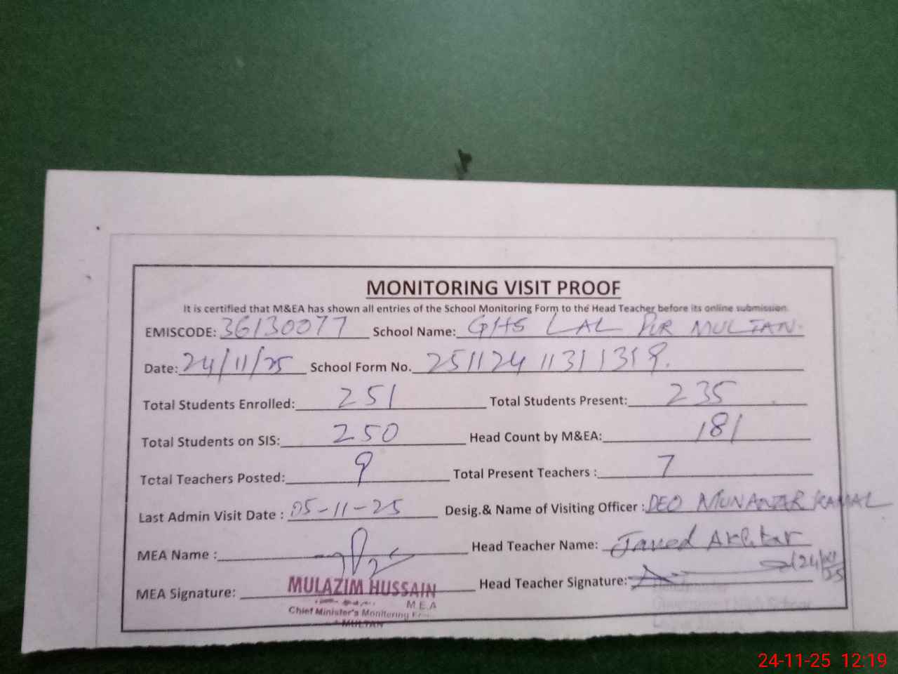 | Attendance Register | Head Teacher | MEA with School | Visit Proof |