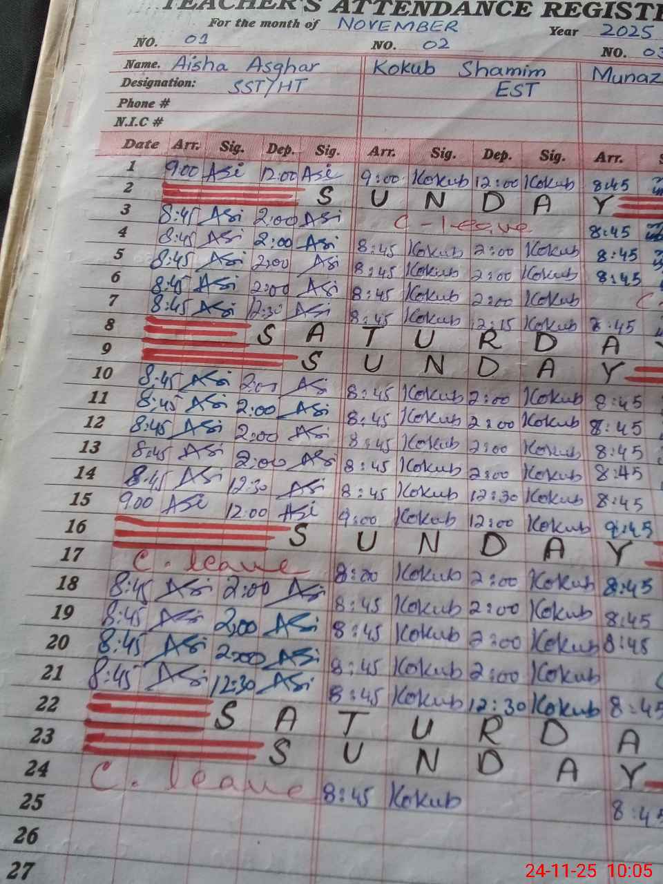 | CNIC | Full Name | Designation | R/C | Absence During Last Calender Month |