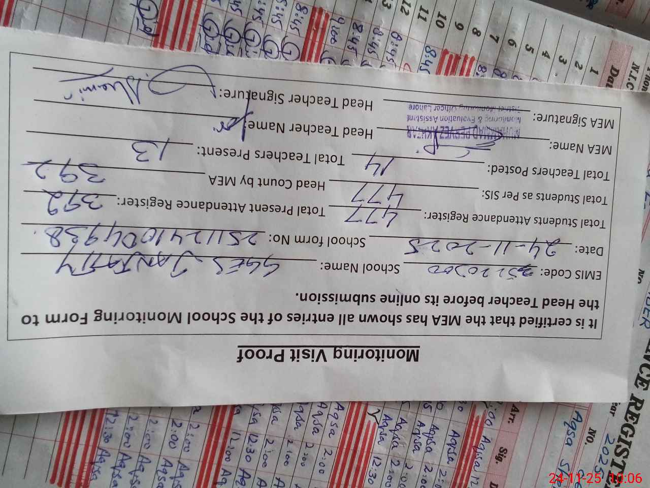 | Attendance Register | Head Teacher | MEA with School | Visit Proof |