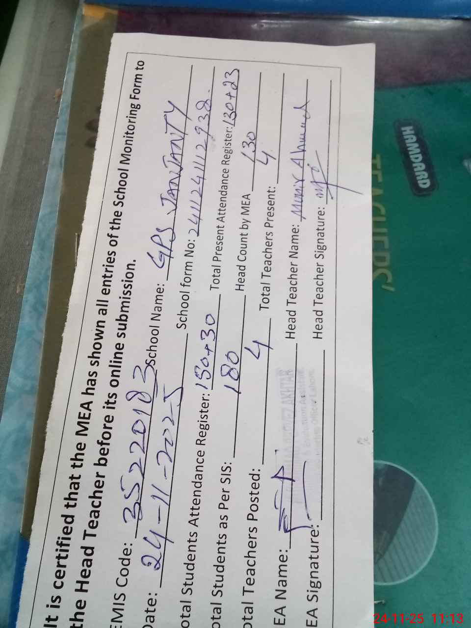 | Attendance Register | Head Teacher | MEA with School | Visit Proof |