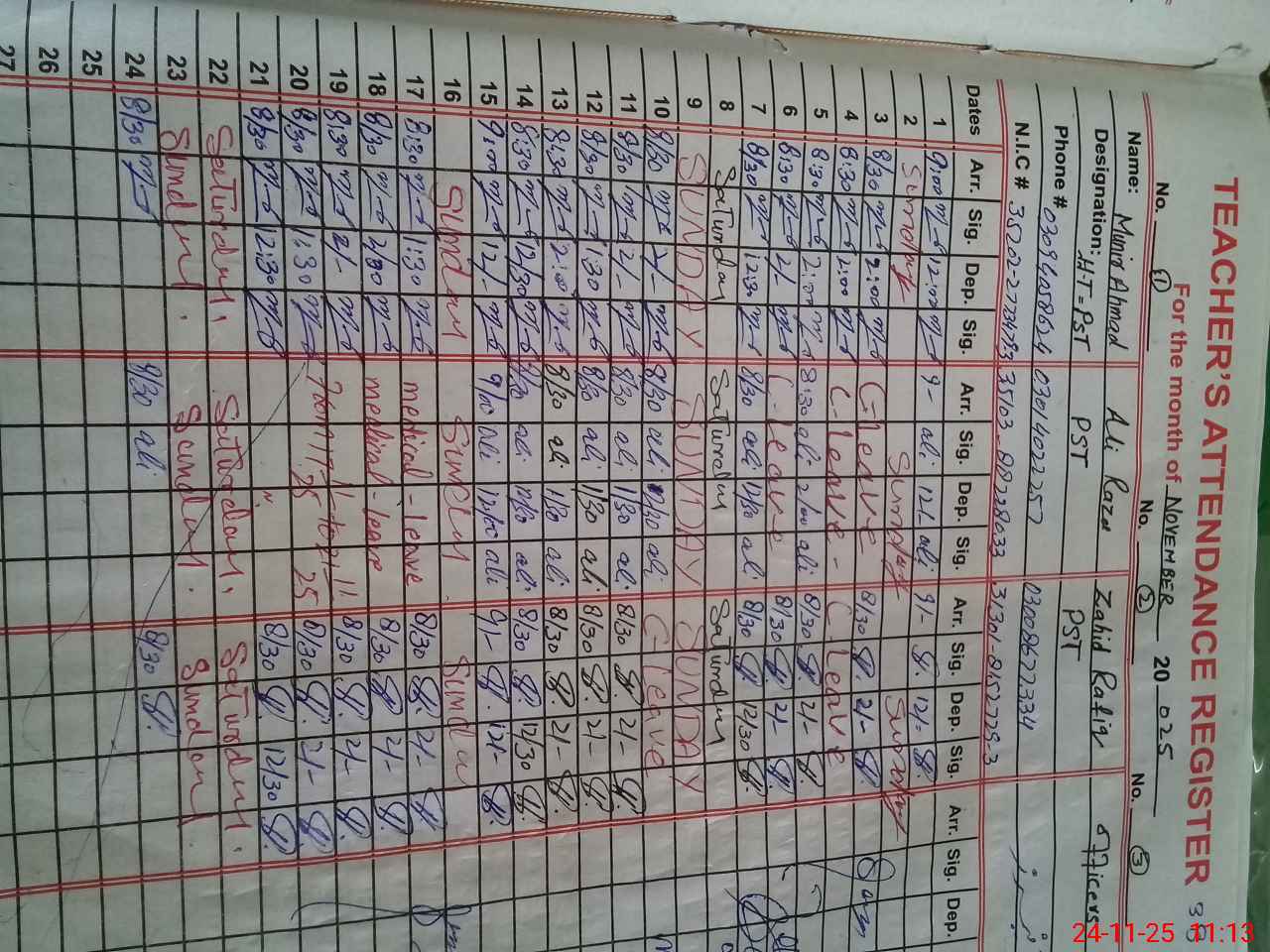 | CNIC | Full Name | Designation | R/C | Absence During Last Calender Month |
