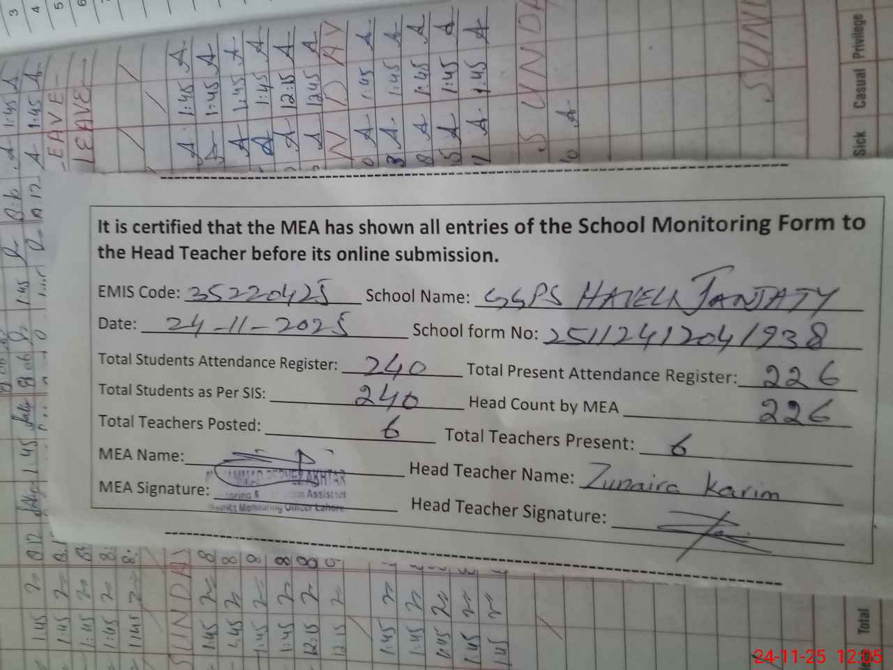 | Attendance Register | Head Teacher | MEA with School | Visit Proof |