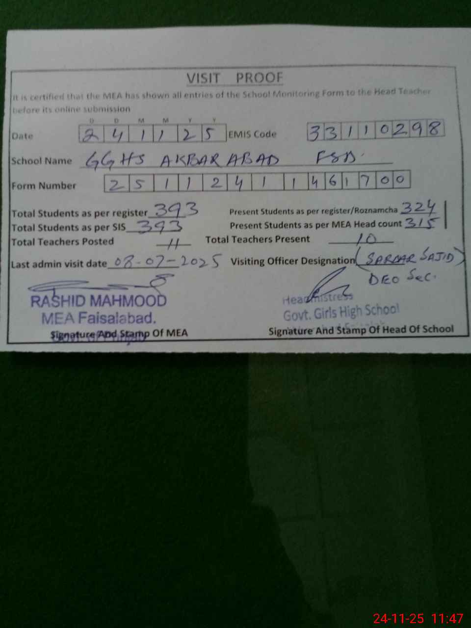| EMIS Code: 33110298 | Name of School: GGHS AKBAR ABAD FSD | |||