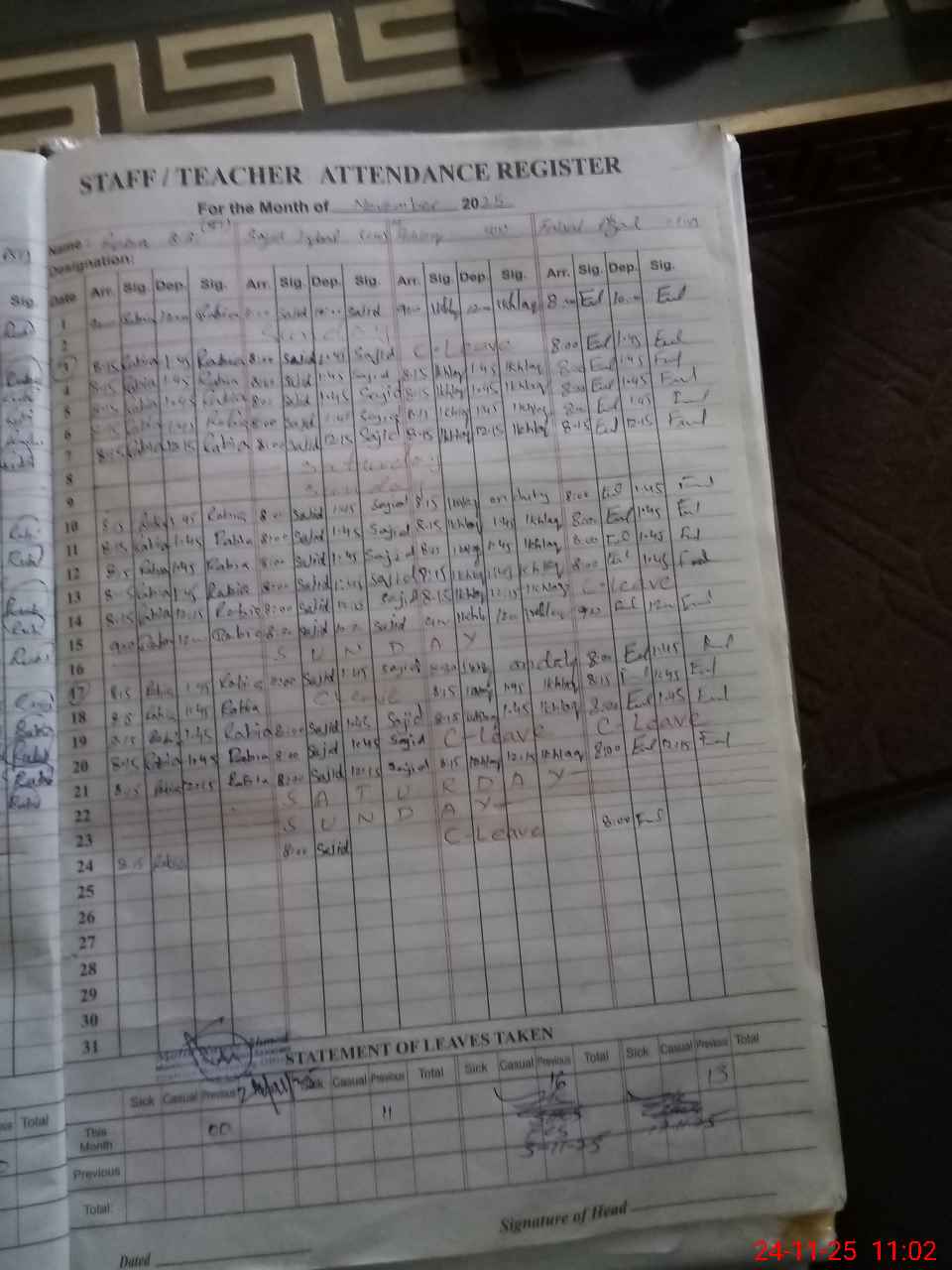 | Leave | Duty | Absent | Maternity | Medical | Ex- Pak |