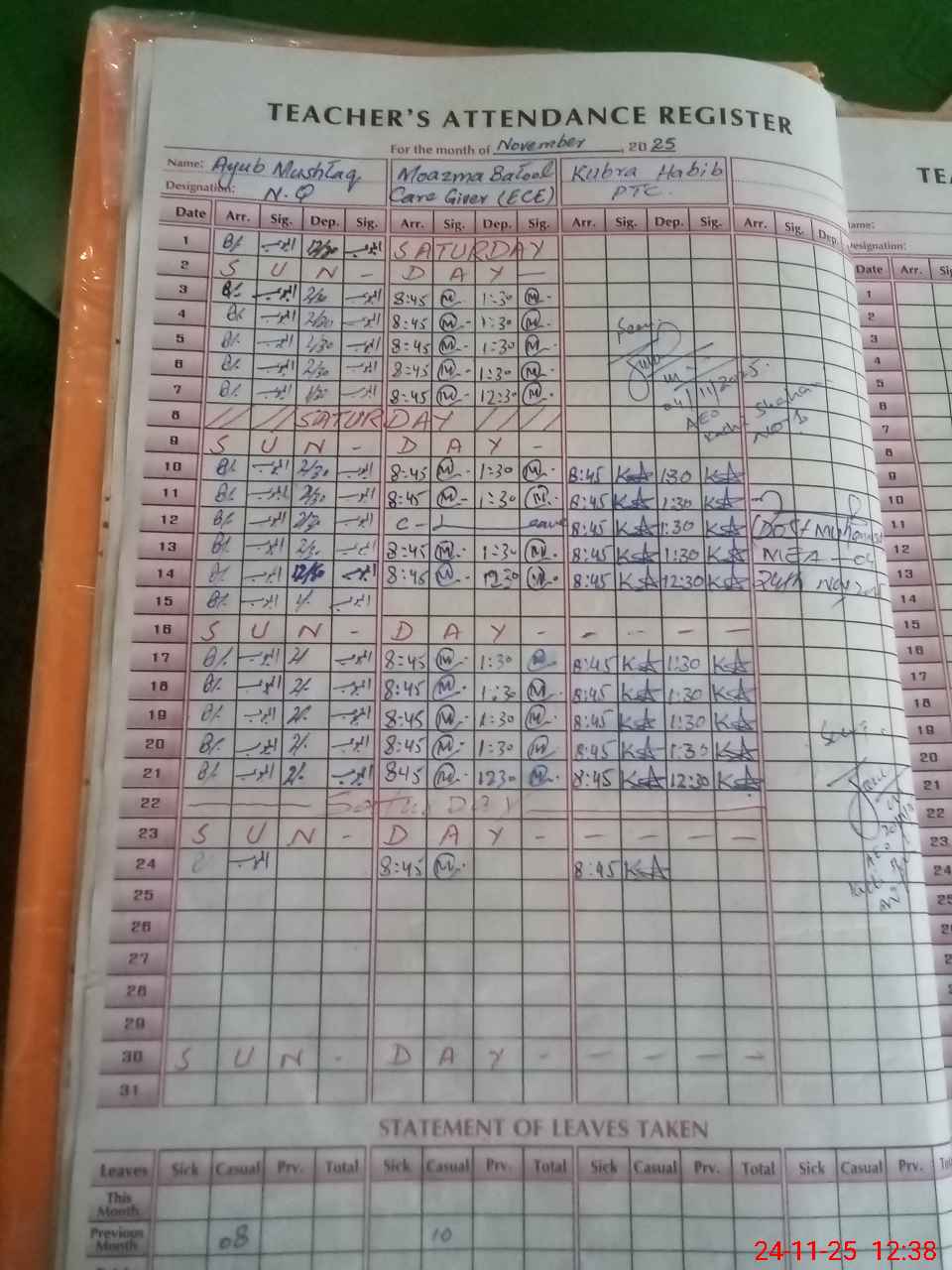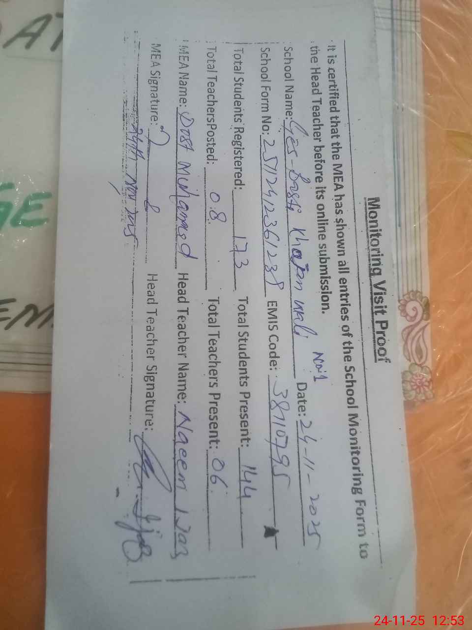 | Remarks (Use Separate Page if Required): All the entered data loudly share with the head teacher before submitting Last visited the subject school by Educational Authority Muhammad Aamir Khan AEO Dated- 22nd October 2025 | |||||