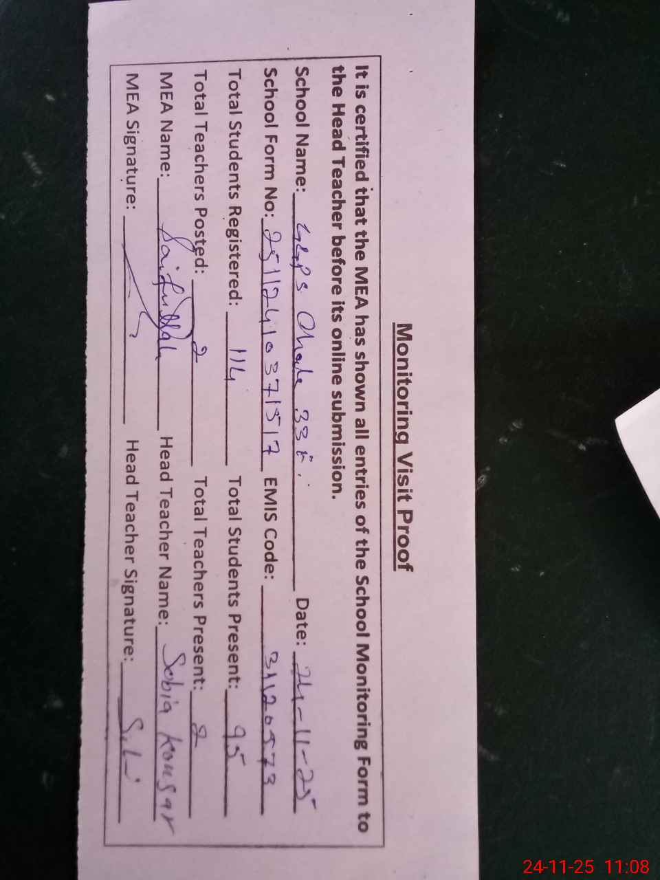 | Attendance Register | Head Teacher | MEA with School | Visit Proof |