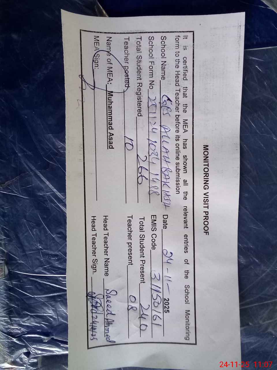| Certified that this School was Inspected by the Undersigned MEA/DMO Today and the Information Stated Above is as Per Record. | |||||