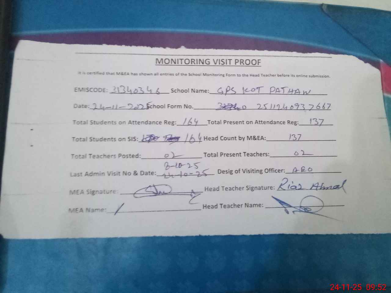 | Attendance Register | Head Teacher | MEA with School | Visit Proof |