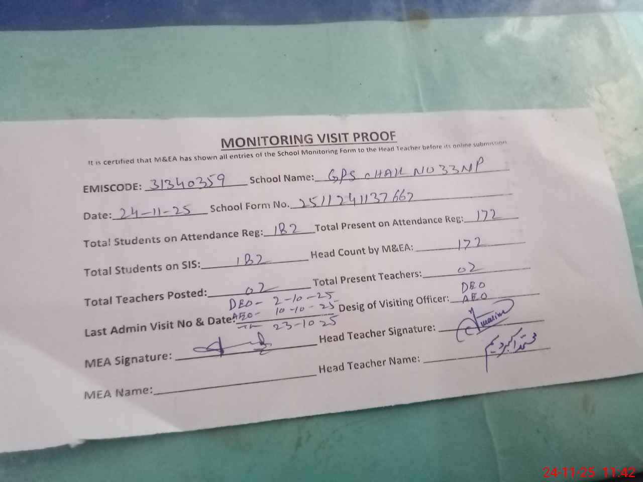 | Attendance Register | Head Teacher | MEA with School | Visit Proof |